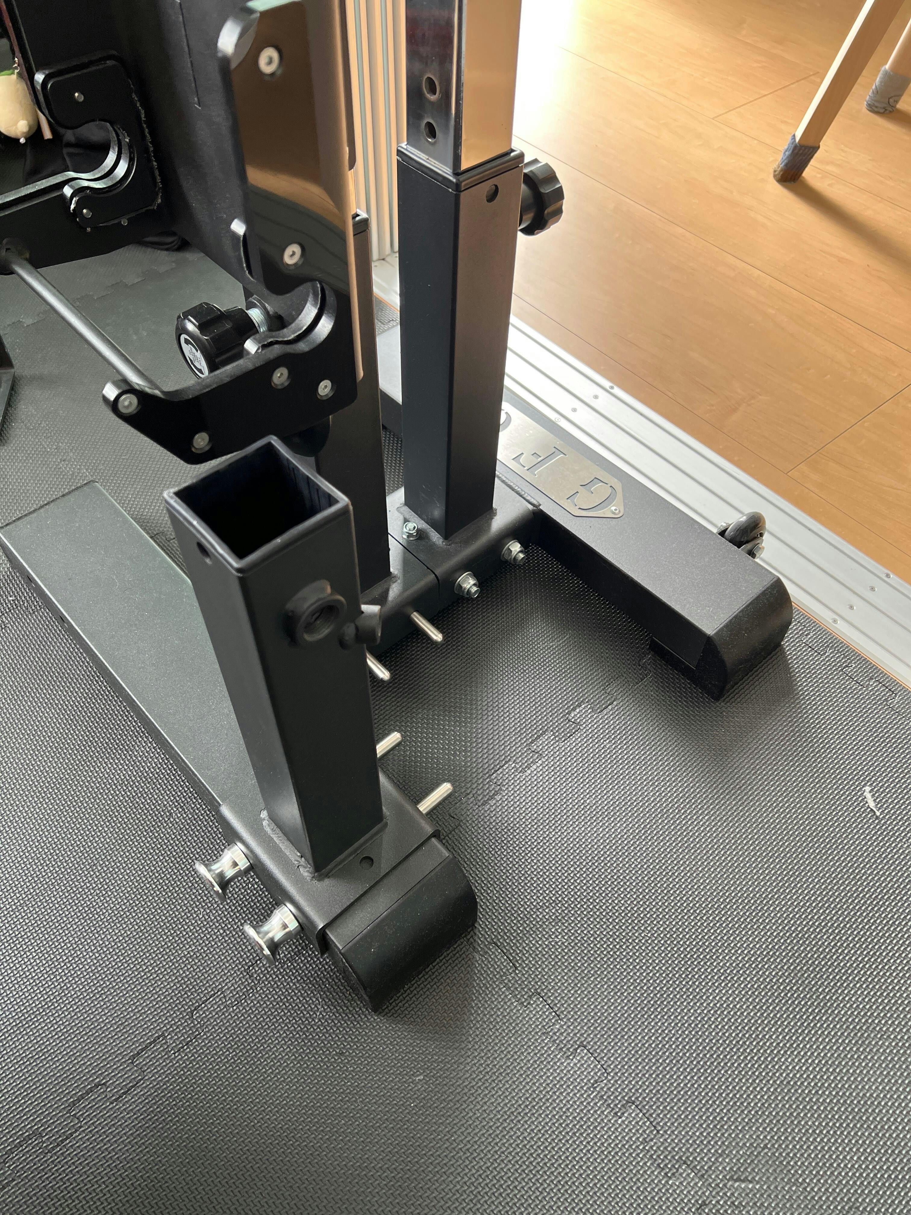 レッグストレングスのアタッチメントと入替えて使用可能。圧倒的省スペースで腰に易しく本格スクワット