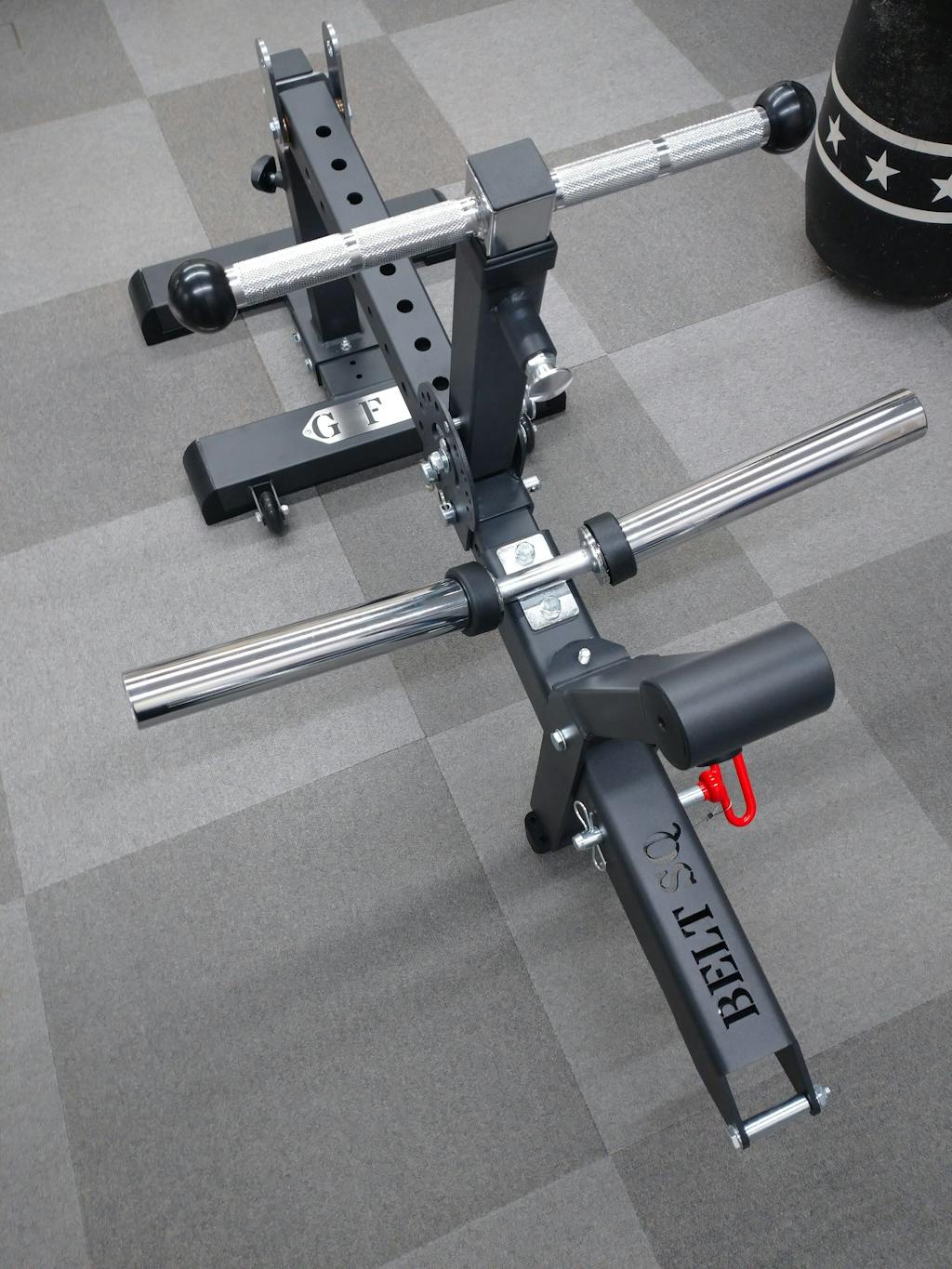 ベルトスクワットアタッチメント。コンパクトかつ本格仕様のベルトスクワットは下半身への負担がなく骨盤に直接負荷をかけるため、首や肩の可動域が狭い方や腰痛持ちの方でも安全に下半身のトレーニングを行うことが可能。