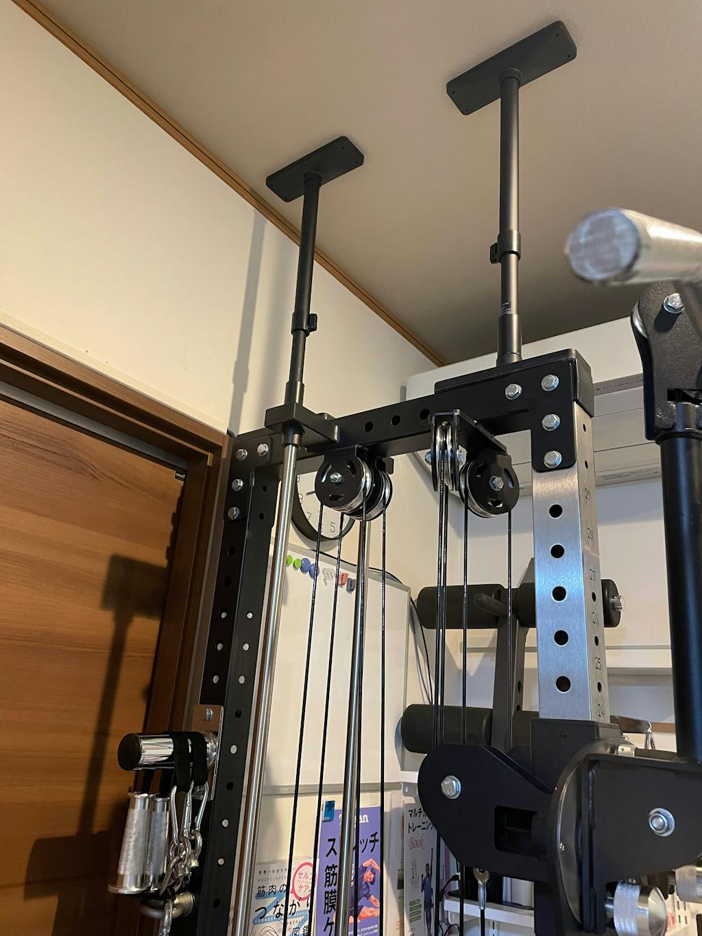 悩んだのは邪魔になるかどうか。移動も考え、キャスターも購入しましたが不用でした。思った以上に省スペースで、やれるトレーニングが増えて導入して良かったです。隙間にベンチなど収納できるので我が家の環境に合いました。天井突っ張りのみでも安定して使用できます。